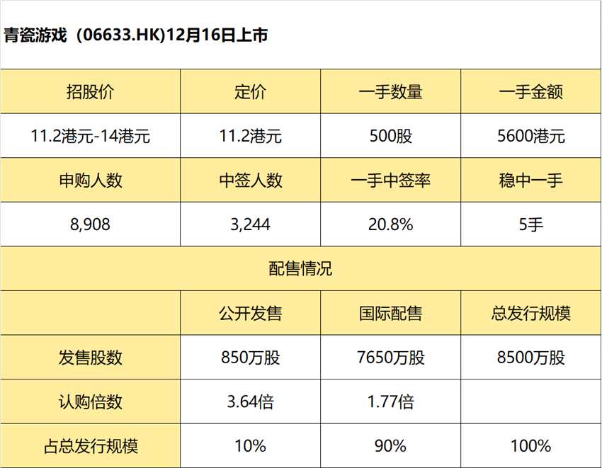12月15日消息,青瓷游戲暗盤報10.32港元,較發(fā)行價跌7.86%。公司每股定價11.2港元,每手500股,將于12月16日(周四)港股掛牌上市。