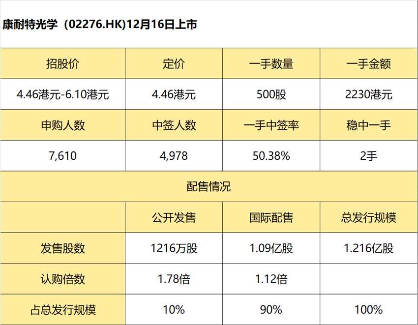 康耐特光學暗盤報**港元,較發(fā)行價跌4.71%。公司每股定價4.46港元,每手500股,將于12月16日(周四)港股掛牌上市。