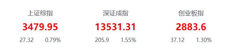 截至收盤,滬指上漲0.79%,報3479.95點;深成指上漲1.55%,報13531.31點;創(chuàng)業(yè)板指(399006.SZ)上漲1.30%,報2883.6點。