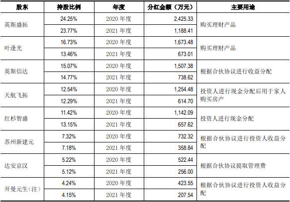 報(bào)告期內(nèi),英諾特進(jìn)行過兩次股利分配,現(xiàn)金分紅金額合計(jì)1.50億元。2020年和2021年1-6月,公司分別現(xiàn)金分紅1.00億元、5000.00萬元。根據(jù)第三輪審核問詢函回復(fù),英諾特實(shí)際控制人和主要股東分紅款流向主要用于購買理財(cái)產(chǎn)品、投資人根據(jù)合伙協(xié)議進(jìn)行收益分配等。其中,實(shí)際控制人葉逢光共獲得分紅2346.49萬元,用于購買理財(cái)產(chǎn)品。