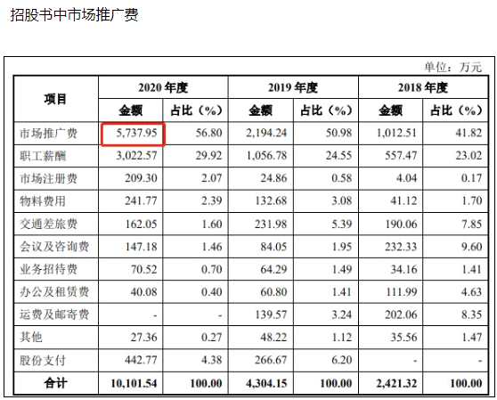 據(jù)和訊網(wǎng),報(bào)告期內(nèi),英諾特市場推廣費(fèi)占比逐年增加,從2018年41.82%上漲至56.8%,是銷售費(fèi)用中占比最高的一部分。與同行業(yè)可比公司比較,英諾特市場推廣費(fèi)占比也遠(yuǎn)高于可比公司。審核問詢函的回復(fù)數(shù)據(jù)顯示,英諾特2018年-2020年市場推廣費(fèi)占比分別為41.82%、53.62%、57.08%,而行業(yè)平均值分別為23.52%、21.69%、26.26%。