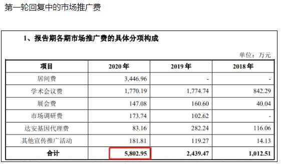 不過,值得一提的是,招股書中的市場推廣費(fèi)與英諾特第一輪問詢回復(fù)中的數(shù)據(jù)并不一致。2020年,招股書中,市場推廣費(fèi)為5737.95萬元;而回復(fù)函中,市場推廣費(fèi)為5802.95萬元,高出65萬元。2019年,招股書載明的市場推廣費(fèi)為2194.26萬元,回復(fù)函中為2439.47萬元,相差245.21萬元。