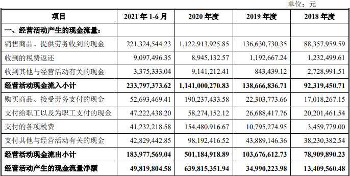2018年至20201年1-6月,英諾特銷售商品、提供勞務(wù)收到的現(xiàn)金分別為8835.80萬元、1.37億元、11.23億元、2.21億元;經(jīng)營活動(dòng)產(chǎn)生的現(xiàn)金流量凈額分別為1340.96萬元、3499.02萬元、6.40億元、4981.98萬元。