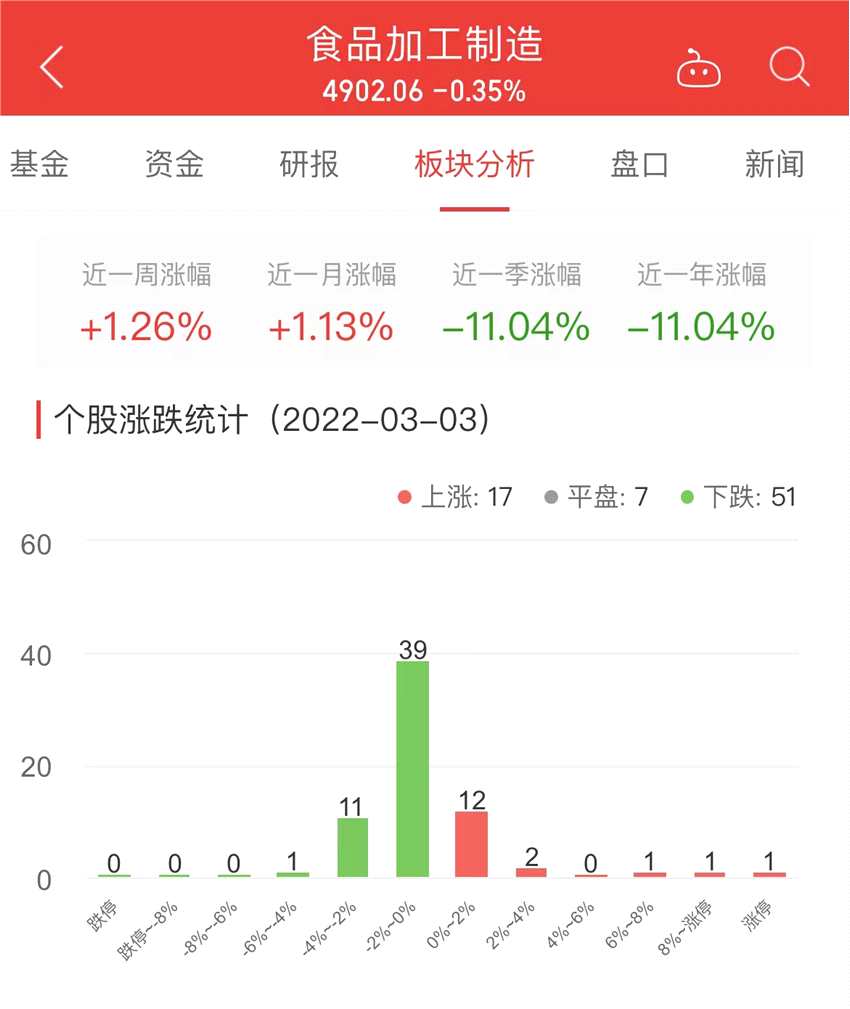 數(shù)據(jù)顯示,截至今日,食品加工制造板塊近一周漲幅1.26%,近一月漲幅1.13%,近一季漲幅-11.04%。