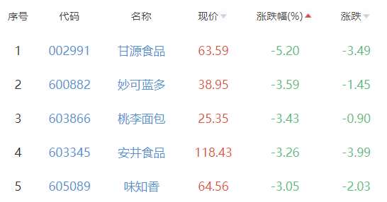 甘源食品、妙可藍(lán)多、桃李面包、安井食品和味知香位列板塊漲幅榜后五位,漲幅分別為-5.20%、-3.59%、-3.43%、-3.26%和-3.05%。