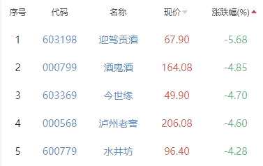 迎駕貢酒、酒鬼酒、今世緣、瀘州老窖、水井坊位列漲幅榜后五位,漲幅分別為-5.68%、-4.85%、-4.70%、-4.60%、-4.28%。