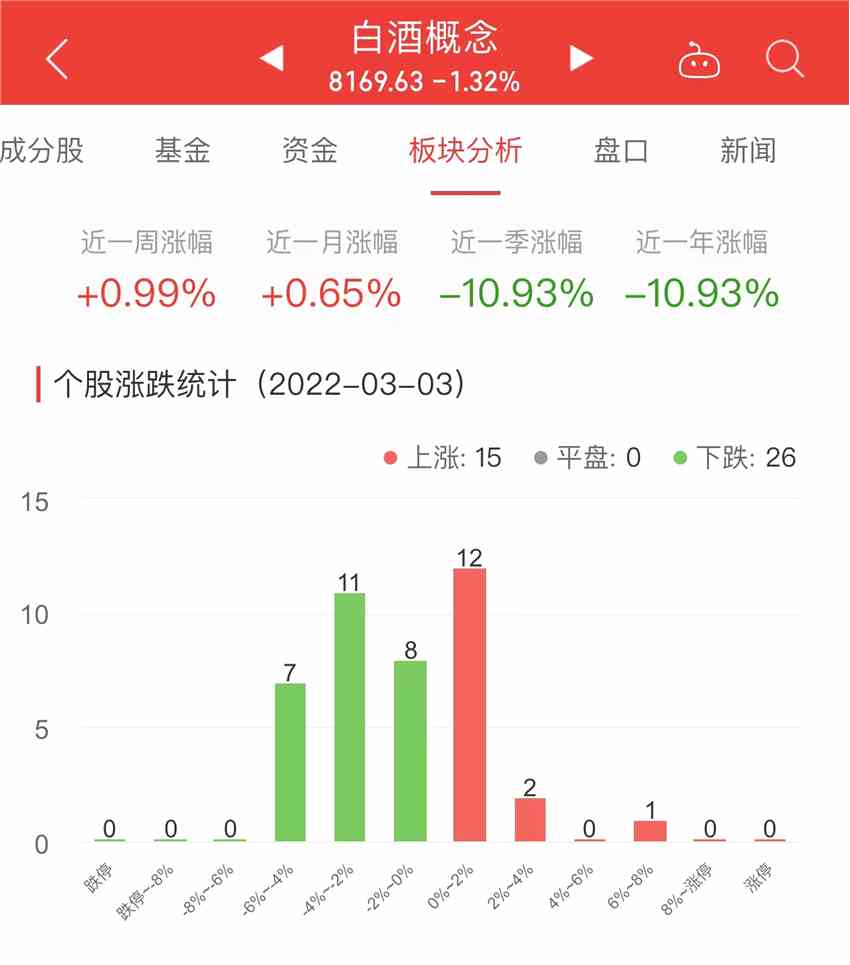 今日,白酒概念板塊整體跌幅1.32%,其中15只股票上漲,0只股票平盤,26只股票下跌。