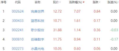 其中,完美世界、藍(lán)思科技、歌爾股份、創(chuàng)維數(shù)字和水晶光電位列板塊漲幅榜前五位,漲幅分別為7.07%、1.61%、1.14%、0.94%和0.60%。