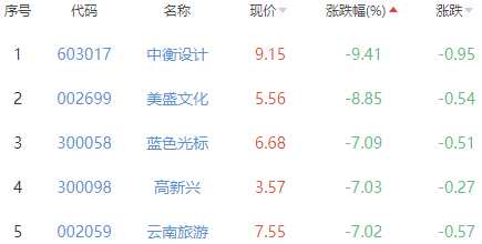 中衡設(shè)計、美盛文化、藍(lán)色光標(biāo)、高新興和云南旅游位列板塊漲幅榜后五位,漲幅分別為-9.41%、-8.85%、-7.09%、-7.03%和-7.02%。