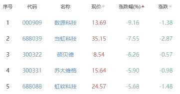 數(shù)源科技、當(dāng)虹科技、碩貝德、蘇大維格、虹軟科技位列漲幅榜后五位,漲幅分別為-9.16%、-7.55%、-6.26%、-5.90%、-5.68%。