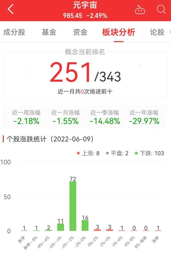 互聯(lián)網(wǎng)北京6月9日訊今日,元宇宙板塊整體跌幅2.49%,其中8只股票上漲,2只股票平盤,103只股票下跌。