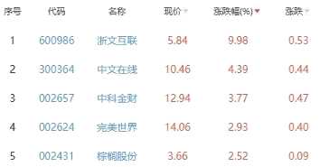 其中,浙文互聯(lián)、中文在線、中科金財(cái)、完美世界、棕櫚股份位列板塊漲幅前五位,漲幅分別為9.98%、4.39%、3.77%、2.93%、2.52%。