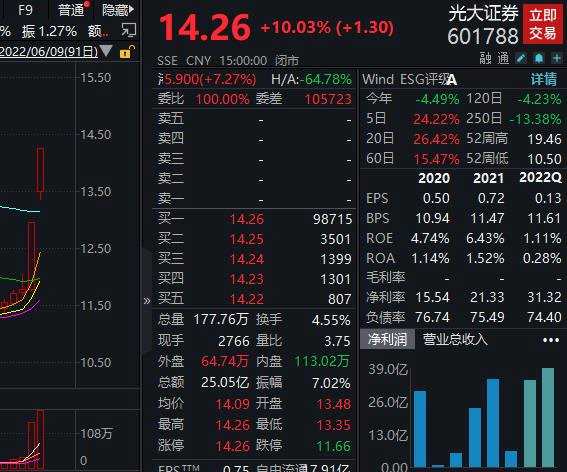 6月9日,光大證券連續(xù)第二日漲停,報(bào)14.26元,成交額超25億元,該股近3日累漲近22%。