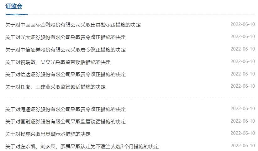 6月10日晚間,證監(jiān)會(huì)密集發(fā)布10封行政監(jiān)管措施決定公告,分別涉及中信證券(600030.SH,06030.HK)、中金公司(601995.SH,03908.HK)、海通證券(600837.SH、06837.HK)、光大證券(601788.SH、06178.HK)、信達(dá)證券、國融證券。