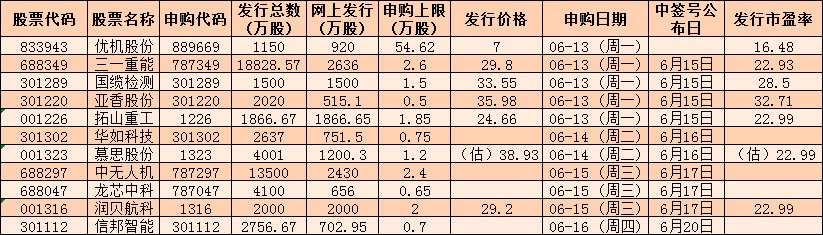 表:下周(6月13日-17日)11只新股發(fā)行情況: