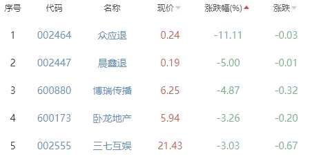 眾應(yīng)退、晨鑫退、博瑞傳播、臥龍地產(chǎn)、三七互娛位列漲幅榜后五位,漲幅分別為-11.11%、-5.00%、-4.87%、-3.26%、-3.03%。
