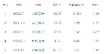 其中,中炬高新、寶立食品、日辰股份、加加食品、安井食品位列板塊漲幅前五位,漲幅分別為10.00%、9.99%、5.32%、4.06%、3.27%。