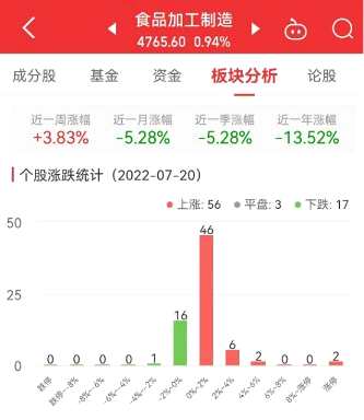 今日,食品加工制造板塊整體漲幅0.94%,其中,56只股票上漲,3只股票平盤,17只股票下跌。
