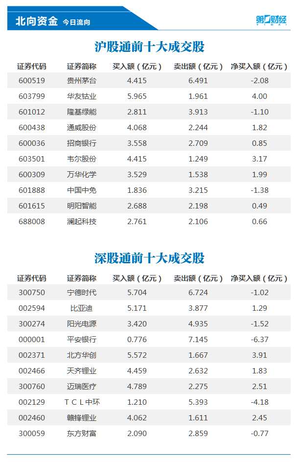 前十大成交股中,凈買(mǎi)入額居前三的是華友鈷業(yè)、北方華創(chuàng)、韋爾股份,分別凈買(mǎi)入4.0億元、3.91億元、3.17億元。