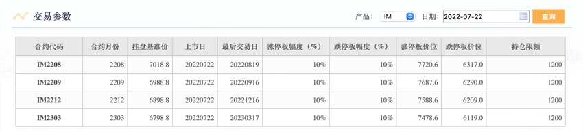 7月21日,中金所發(fā)布《關(guān)于中證1000股指期貨和股指期權(quán)首批上市合約掛盤基準(zhǔn)價的通知》。7月22日,中證1000股指期貨IM2208合約、IM2209合約、IM2212合約和IM2303合約上市,掛盤基準(zhǔn)價分別為7018.8點(diǎn)、6988.8點(diǎn)、6898.8點(diǎn)和6798.8點(diǎn)。