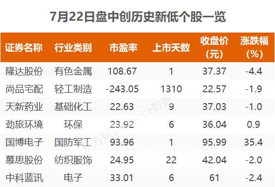 數(shù)據(jù)顯示,今日有7只個股盤中股價創(chuàng)歷史新低,包括天新藥業(yè)等。