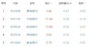 青島銀行、寧波銀行、杭州銀行、鄭州銀行、紫金銀行位列漲幅榜后五位,漲幅分別為-0.57%、-0.56%、-0.50%、-0.38%、-0.36%。