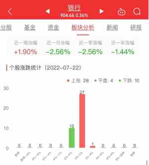 今日,銀行板塊整體漲幅0.36%,其中28只股票上漲,4只股票平盤,10只股票下跌。