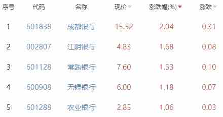 其中,成都銀行、江陰銀行、常熟銀行、無錫銀行、農(nóng)業(yè)銀行位列板塊漲幅前五位,漲幅分別為2.04%、1.68%、1.33%、1.18%、1.06%。