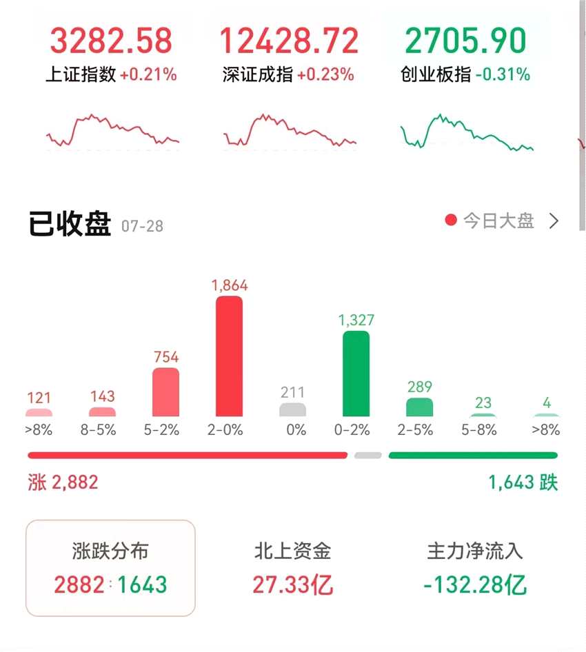 7月28日,三大股指震蕩,漲跌不一。截至收盤(pán),上證指數(shù)漲0.21%報(bào)3282.58點(diǎn),深證成指漲0.23%報(bào)12428.7點(diǎn),創(chuàng)業(yè)板指跌0.31%報(bào)2705.90點(diǎn);兩市合計(jì)成交額達(dá)10074億元,突破萬(wàn)億元關(guān)口;北向資金凈買(mǎi)入27.33億元;總體來(lái)看,兩市個(gè)股漲多跌少。