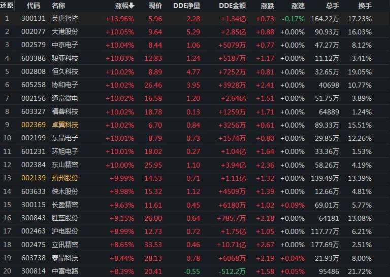 電子行業(yè)漲3.19% 14股集體漲停