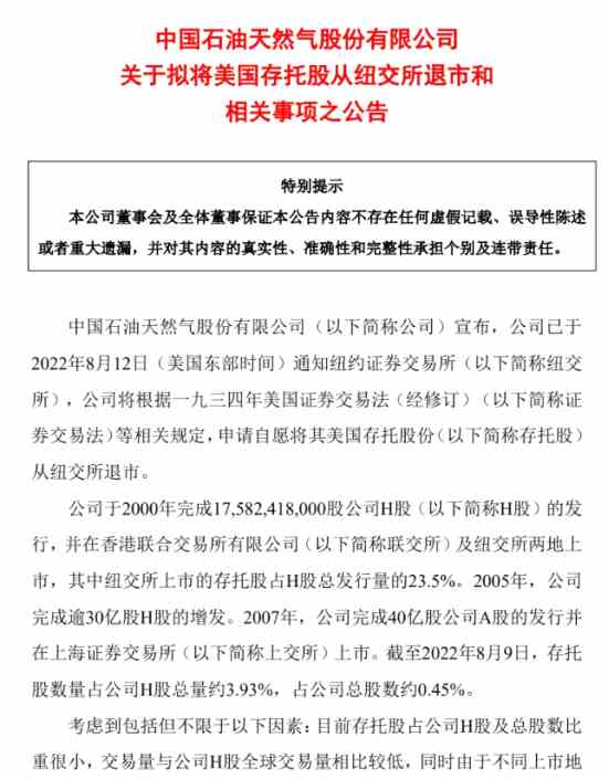 中國石油公告,公司已于2022年8月12日(美國東部時間)通知紐約證券交易所,公司將根據(jù)一九三四年美國證券交易法(經(jīng)修訂)等相關(guān)規(guī)定,申請自愿將其美國存托股份(簡稱存托股)從紐交所退市。