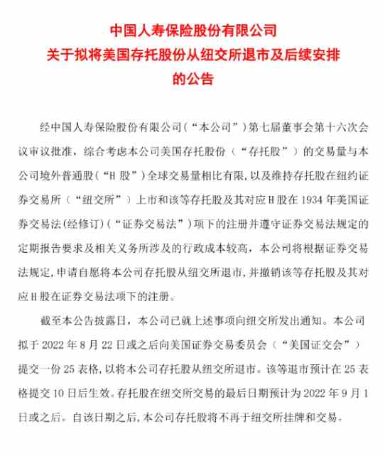 中國人壽公告,本公司將根據(jù)證券交易法規(guī)定,申請自愿將本公司存托股從紐交所退市,并撤銷該等存托股及其對應H股在證券交易法項下的注冊。