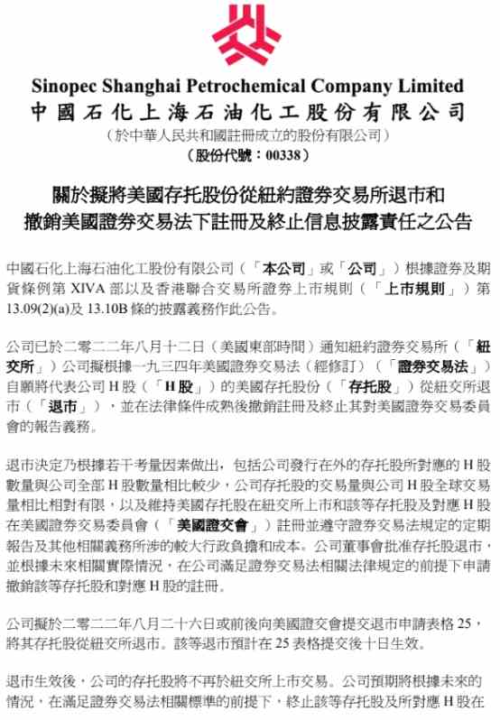 上海石油化工股份在港交所公告稱,擬將美國存托股份從紐約證券交易所退市。
