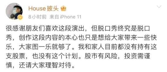 9月13日凌晨,脫口秀演員House微博發(fā)文回應(yīng)稱,“大家圖一樂(lè)就夠了……我和家人目前都沒(méi)有持有這支股票,也沒(méi)有這個(gè)計(jì)劃。股市有風(fēng)險(xiǎn),投資需謹(jǐn)慎,還請(qǐng)大家理智對(duì)待?!?/p>