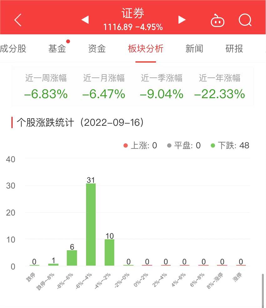 今日,證券板塊整體跌幅4.95%,其中0只股票上漲,0只股票平盤,48只股票下跌。