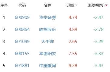 其中,華安證券、哈投股份、太平洋、華創(chuàng)陽安、中國銀河位列板塊漲幅前五位,漲幅分別為-2.47%、-2.78%、-3.29%、-3.33%、-3.43%。