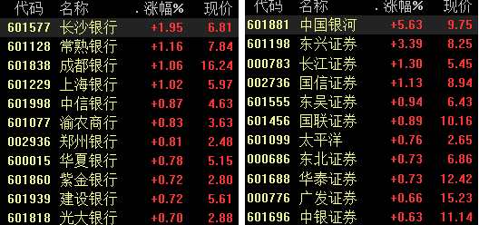 9月23日午后,大金融板塊震蕩拉升,滬指一度翻紅站上3100點,證券、銀行股集體活躍,截至發(fā)稿,中國銀河漲超5%,東興證券、長沙銀行等紛紛走強。