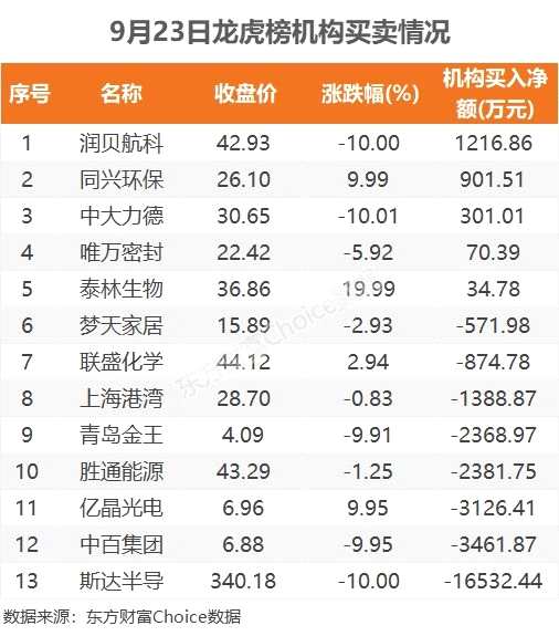 機(jī)構(gòu)參與龍虎榜中個(gè)股共涉及13股,其中5股被機(jī)構(gòu)凈買入,【潤貝航科(001316)、股吧】被買入最多,金額為1216.86萬元。另外8股被機(jī)構(gòu)凈賣出,斯達(dá)半導(dǎo)被賣出最多,金額為1.65億元。