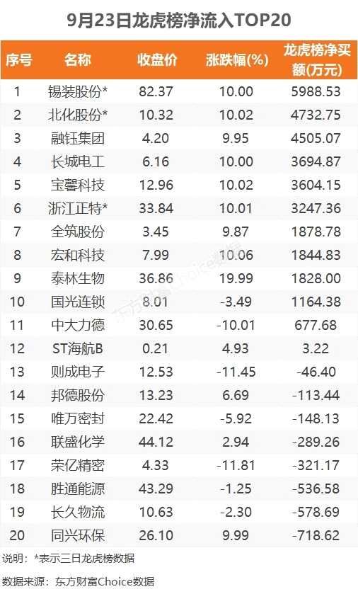 9月23日,上榜龍虎榜個(gè)股中,資金凈流入最多的是【錫裝股份(001332)、股吧】,三日凈買入5988.53萬元。數(shù)據(jù)顯示,該股日內(nèi)漲停收盤,近三日累漲11.72%。資金凈流入居前的浙商證券杭州五星路三日凈買入2812.11萬元。