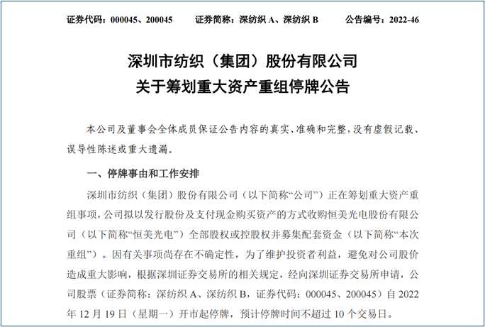 12月18日晚間,深紡織A發(fā)布籌劃重大資產(chǎn)重組停牌公告,公告稱(chēng),公司擬以發(fā)行股份及支付現(xiàn)金購(gòu)買(mǎi)資產(chǎn)的方式收購(gòu)恒美光電全部股權(quán)或控股權(quán)并募集配套資金。由于相關(guān)事項(xiàng)存在不確定性,經(jīng)向深交所申請(qǐng),從12月19日開(kāi)市起停牌,預(yù)計(jì)停牌時(shí)間不超過(guò)10個(gè)交易日。