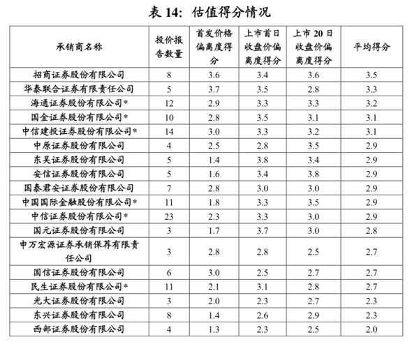 結(jié)果顯示,發(fā)布10份以上投價(jià)報(bào)告的承銷商中,海通證券和中信建投、國金證券估值得分較高,分別為3.2和3.1、3.1,民生證券和中信證券、中金公司得分較低,分別為2.7和2.9、2.9。