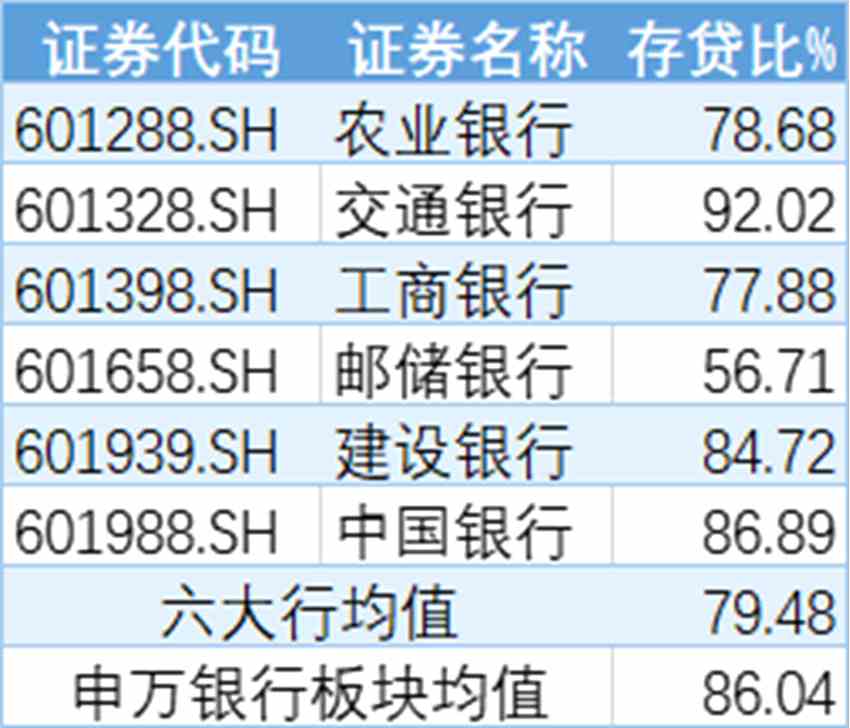 根據(jù)統(tǒng)計(jì),六大行的存貸比均值為79.48%,比板塊整體均值低了將近7個(gè)百分點(diǎn),其中交行和郵儲(chǔ)正好處在兩個(gè)極端上,前者偏高(超過(guò)92%),后者則是過(guò)低(不足60%)。