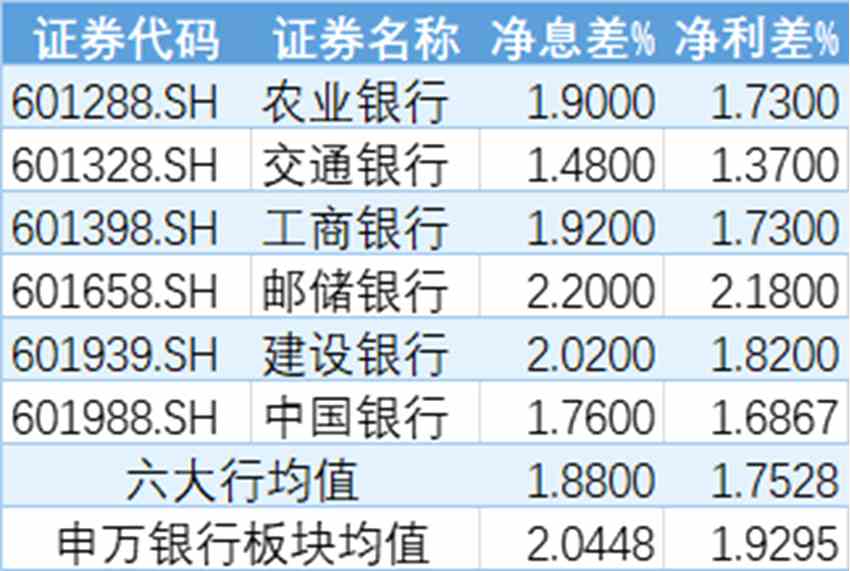 運(yùn)用資產(chǎn)投資(不限于貸款),獲取付出成本和收益之間的差值,是銀行最基本的盈利模式,這也在銀行財(cái)務(wù)報(bào)表中衍生出了凈息差和凈利差兩個(gè)指標(biāo)。二者的不同之處在于計(jì)算方式,凈息差為銀行的凈利息收入與生息資產(chǎn)之比,凈利差則為平均生息資產(chǎn)收益率與平均計(jì)息負(fù)債成本率之差。但不論哪一個(gè)指標(biāo),它們的作用都是銀行運(yùn)用存款等生息資產(chǎn)的盈利能力高低,而國(guó)有銀行在這一項(xiàng)上的表現(xiàn)并不算好。