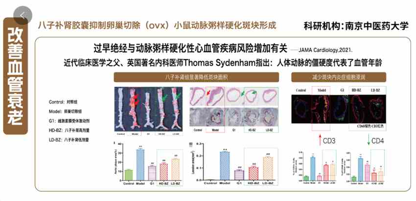 在心血管系統(tǒng)方面,八子補(bǔ)腎膠囊通過(guò)雌激素受體依賴的抗炎、抗凋亡、調(diào)節(jié)脂代謝紊亂作用,有效抑制卵巢切除早衰小鼠動(dòng)脈粥樣硬化斑塊形成;減輕卵巢切除早衰小鼠心肌細(xì)胞線粒體損傷,改善心臟功能;減輕自然衰老小鼠心臟纖維沉積,改善心功能。