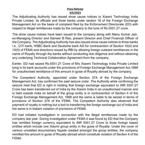 近日,印度執(zhí)法局(ED)6月9日發(fā)布文件稱,因小米涉嫌違反該國《外匯管理法》(FEMA),“向外國實體非法轉(zhuǎn)移資金”,該局已經(jīng)向小米技術(shù)印度私人有限公司、小米印度分公司、部分高管及花旗等三家銀行發(fā)出正式通知。