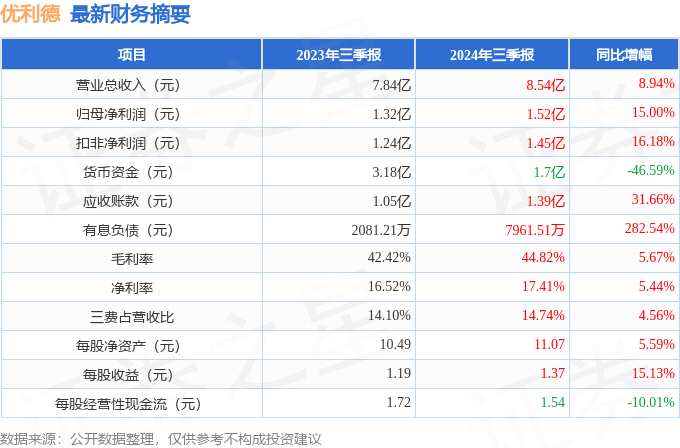 摘要: 據(jù)公開數(shù)據(jù)整理,近期優(yōu)利德(688628)發(fā)布2024年三季報。截至本報告期末,公司營業(yè)總收入8.54億元,同比上升8.94%,歸母凈利潤1.52億元,同比上升15.0%。