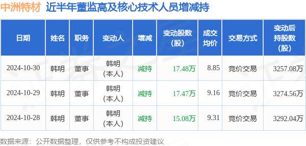 摘要: 消息,根據(jù)10月31日市場(chǎng)公開(kāi)信息、上市公司公告及交易所披露數(shù)據(jù)整理,中洲特材(300963)最新董監(jiān)高及相關(guān)人員股份變動(dòng)情況:2024年10月30日公司董事韓明共減持公司股份17.48萬(wàn)股,