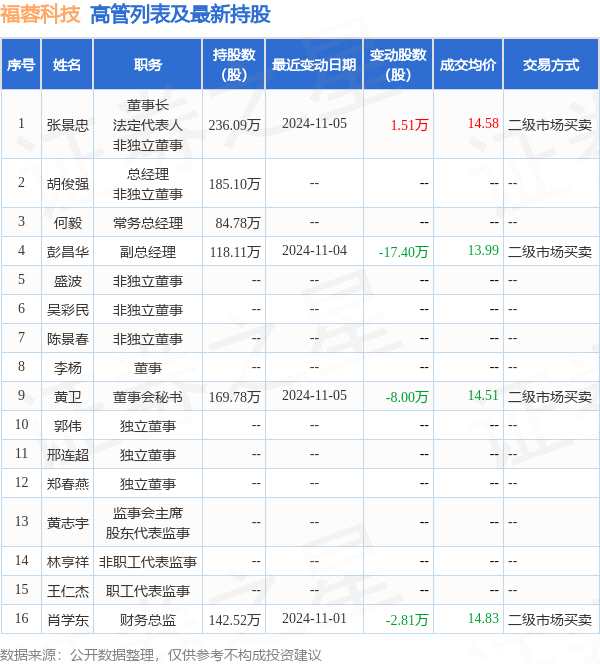 摘要: 消息,根據(jù)11月12日市場公開信息、上市公司公告及交易所披露數(shù)據(jù)整理,福蓉科技(603327)最新董監(jiān)高及相關(guān)人員股份變動情況:2024年11月11日公司高級管理人員肖學東共減持公司股份8.73萬股,