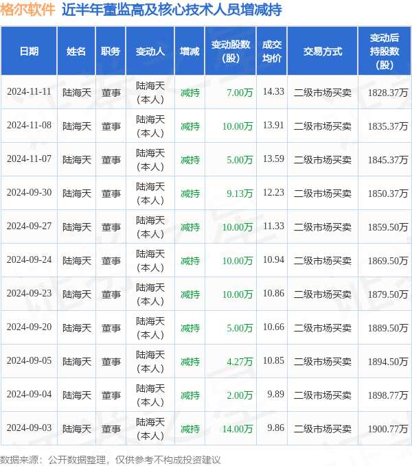 格爾軟件:11月11日高管陸海天減持股份合計(jì)7萬股