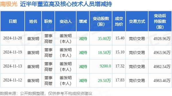 摘要: 消息,根據(jù)11月21日市場公開信息、上市公司公告及交易所披露數(shù)據(jù)整理,南極光(300940)最新董監(jiān)高及相關人員股份變動情況:2024年11月20日公司董事,高管姜發(fā)明共減持公司股份35.0萬股,